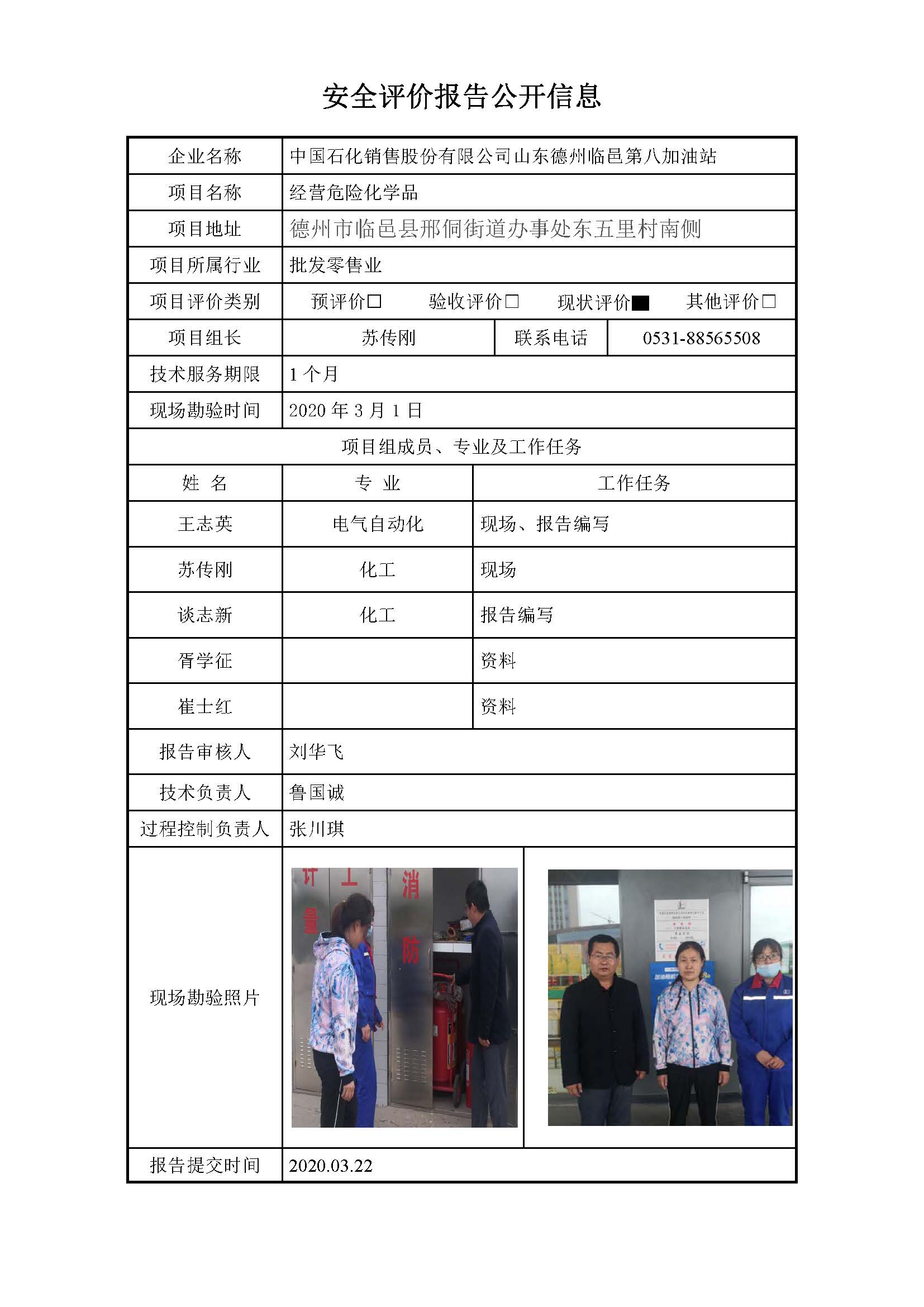 中国石化销售股份有限公司山东德州临邑第八加油站安全评价报告信息公开