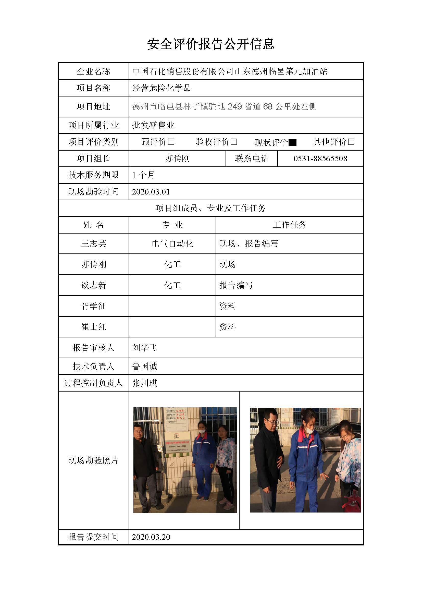 中国石化销售股份有限公司山东德州临邑第九加油站安全评价报告信息公开