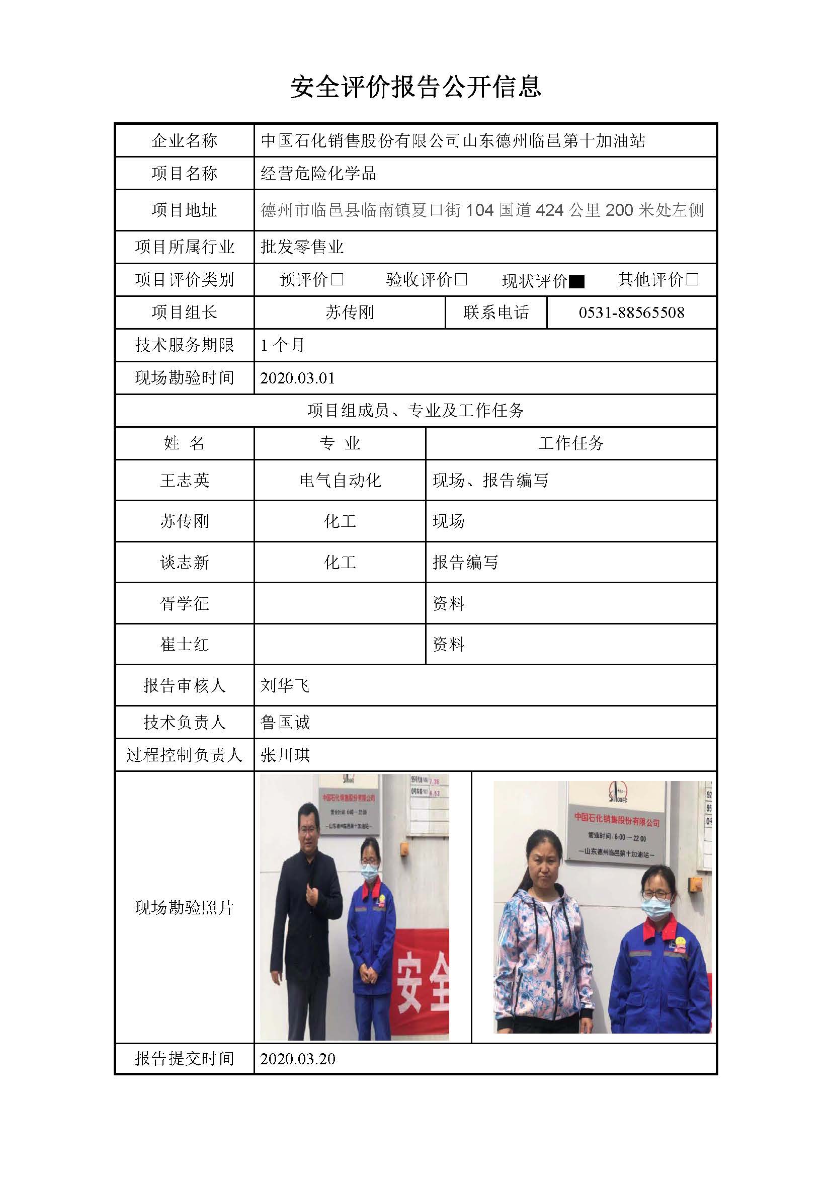 中国石化销售股份有限公司山东德州临邑第十加油站安全评价报告信息公开