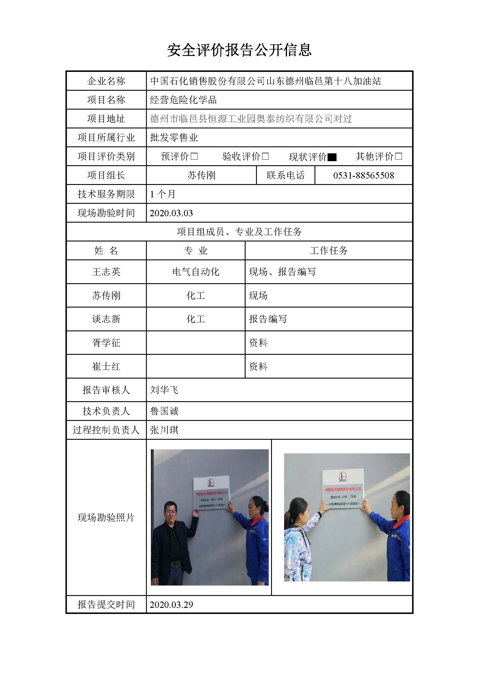 中国石化销售股份有限公司山东德州临邑第十八加油站安全评价报告信息公开