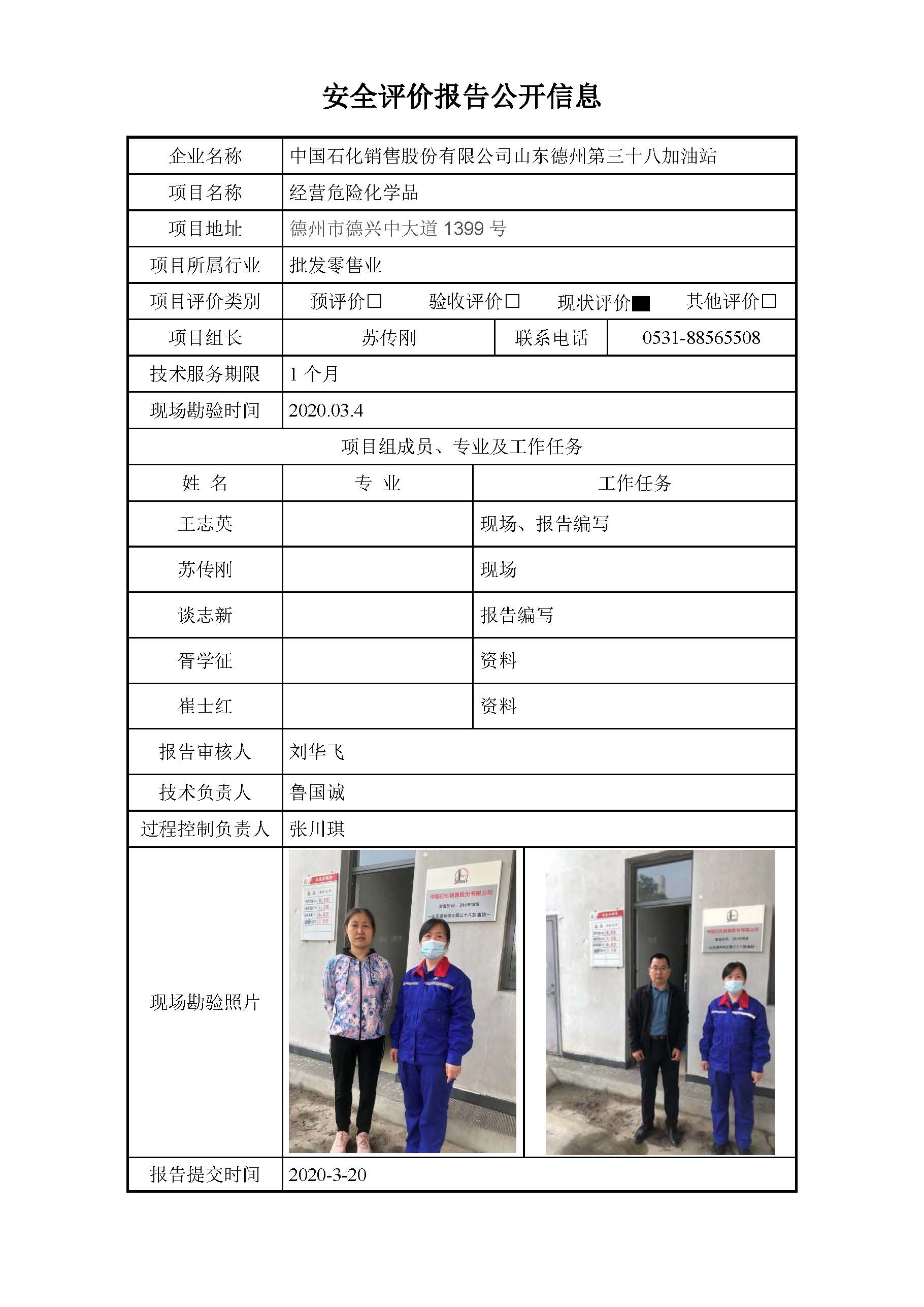 中国石化销售股份有限公司山东德州第三十八加油站安全评价报告信息公开