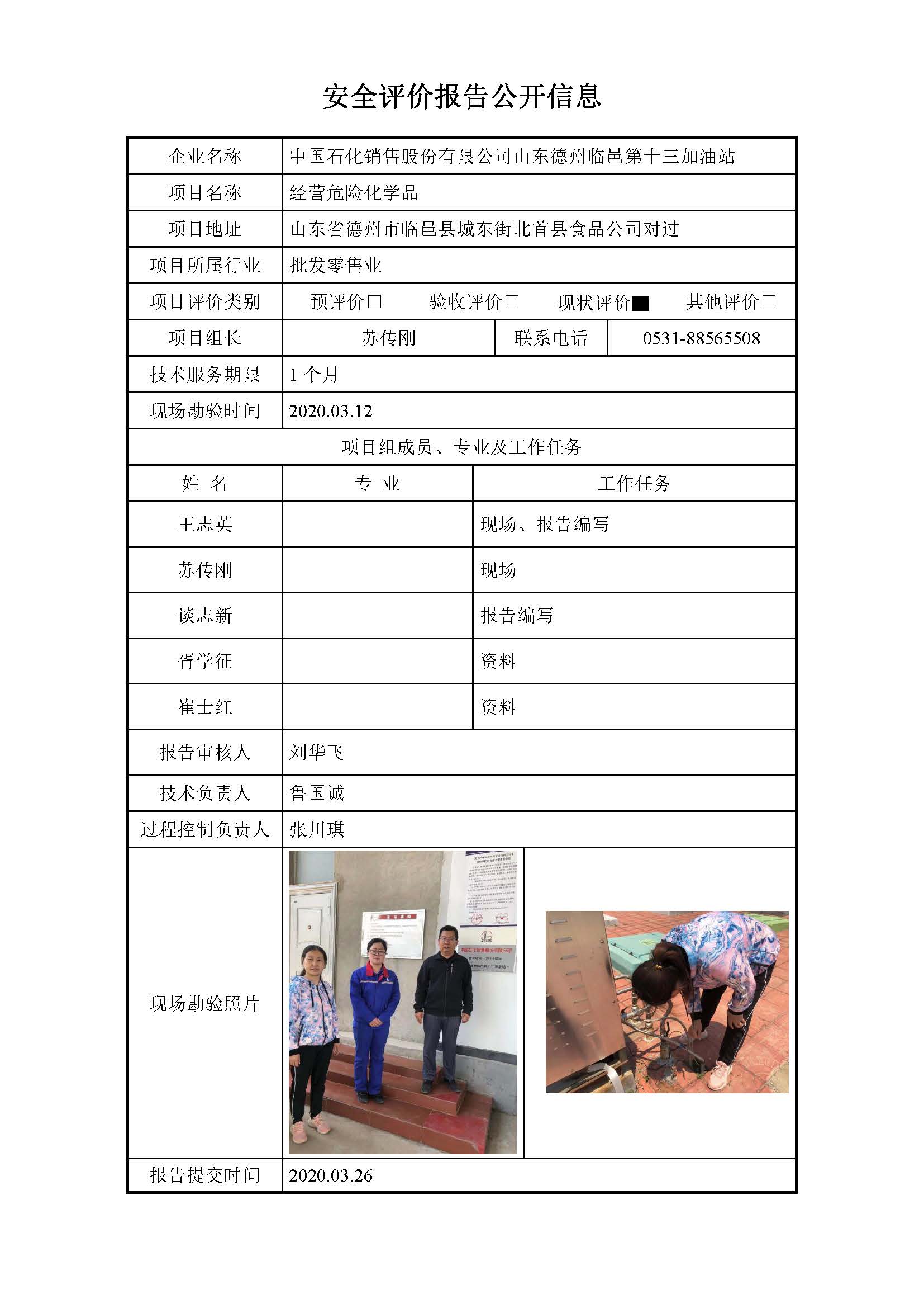 中国石化销售股份有限公司山东德州临邑第十三加油站安全评价报告信息公开
