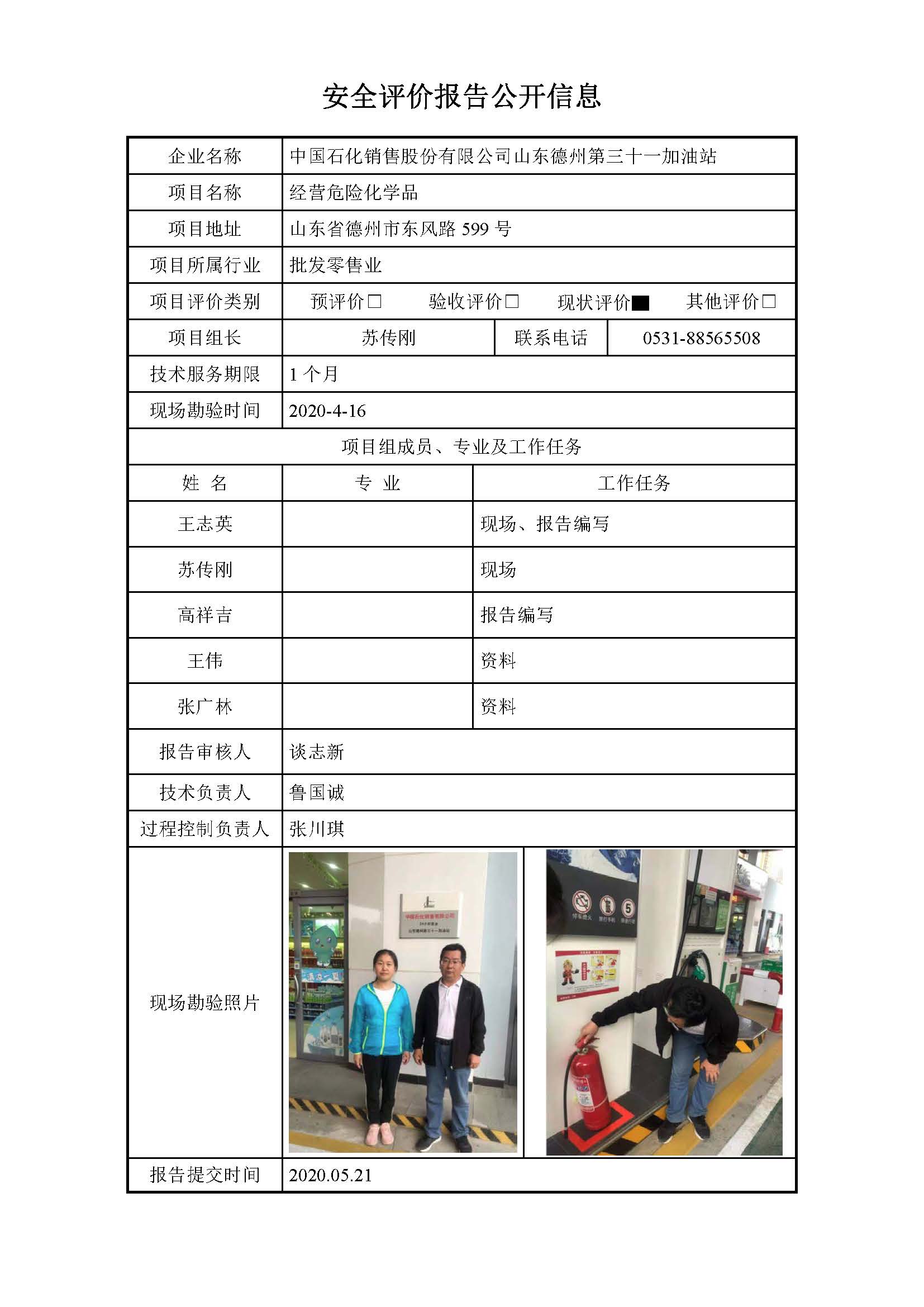 中国石化销售股份有限公司山东德州第三十一加油站安全评价报告信息公开