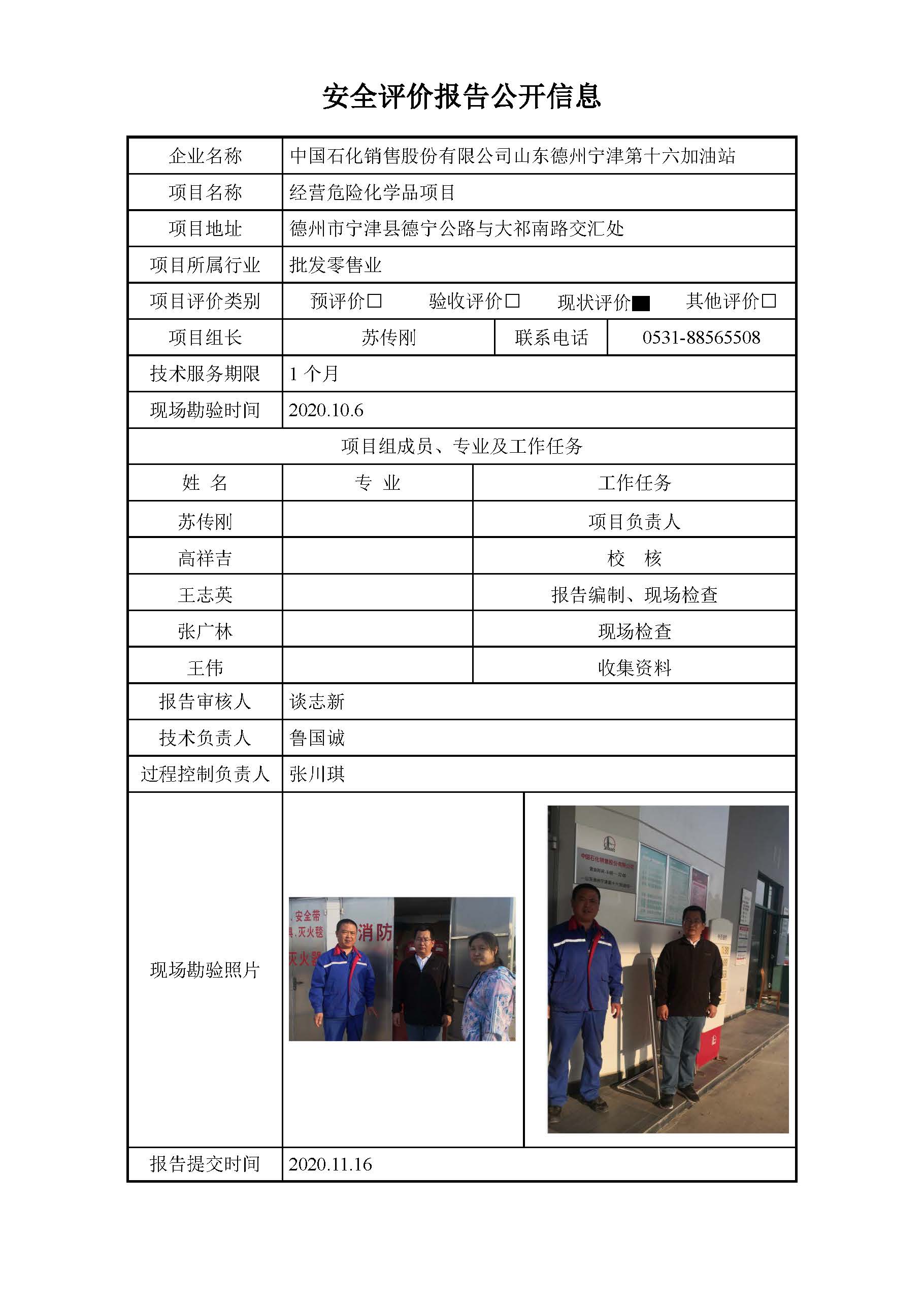 中国石化销售股份有限公司山东德州宁津第十六加油站安全评价报告信息公开