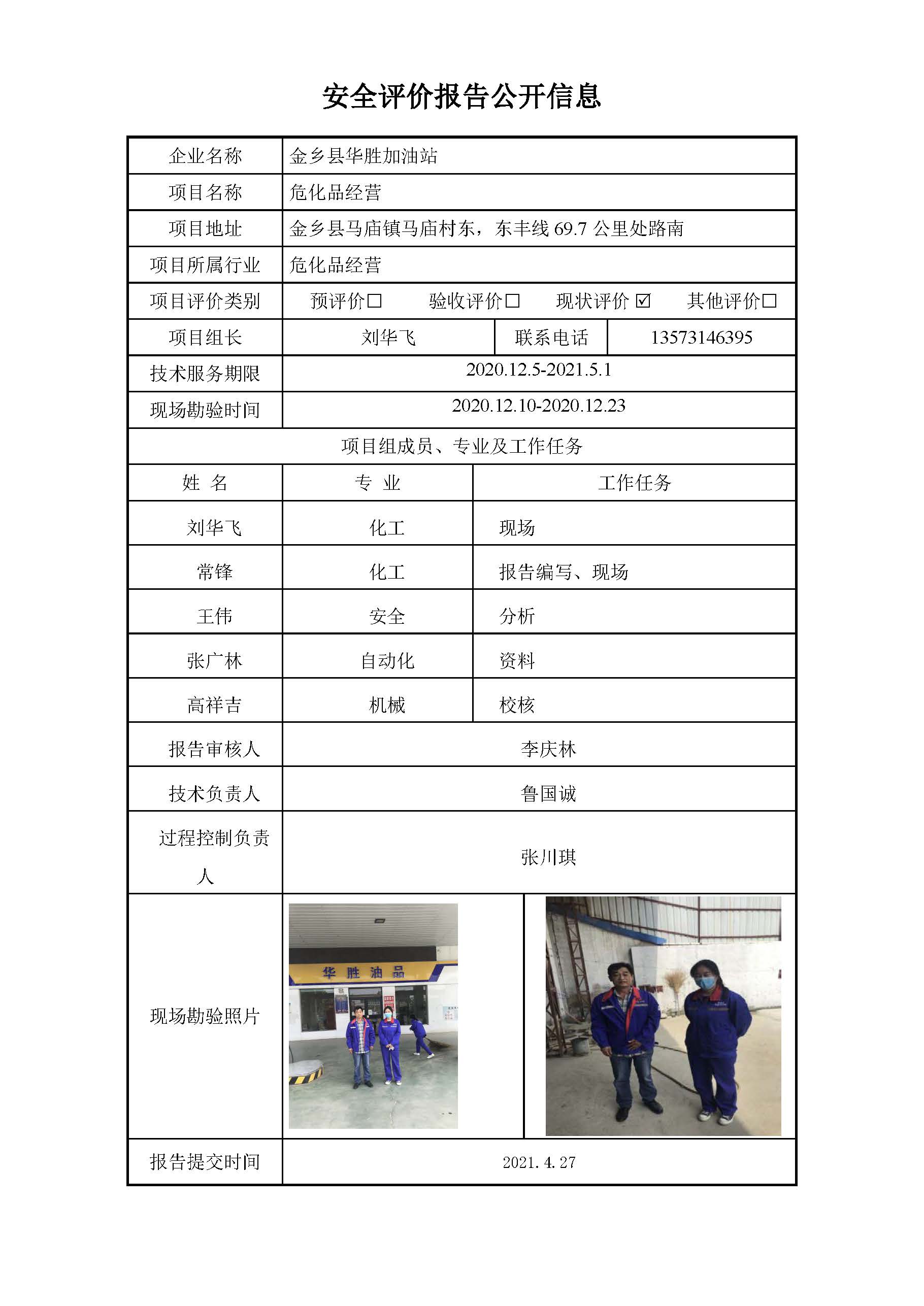 金乡县华胜加油站现状评价安全评价报告信息公开