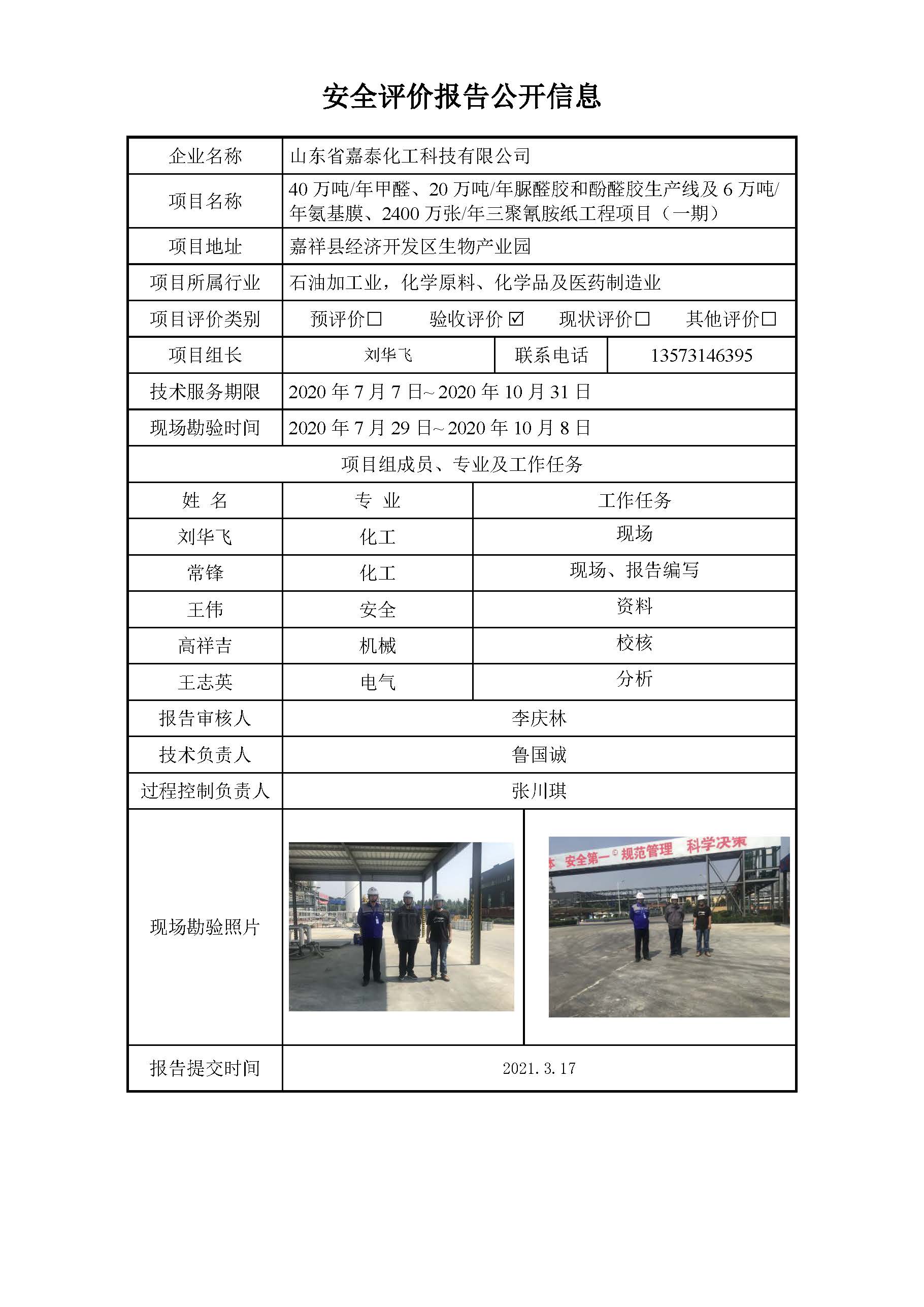 山东省嘉泰化工科技有限公司安全评价报告信息公开