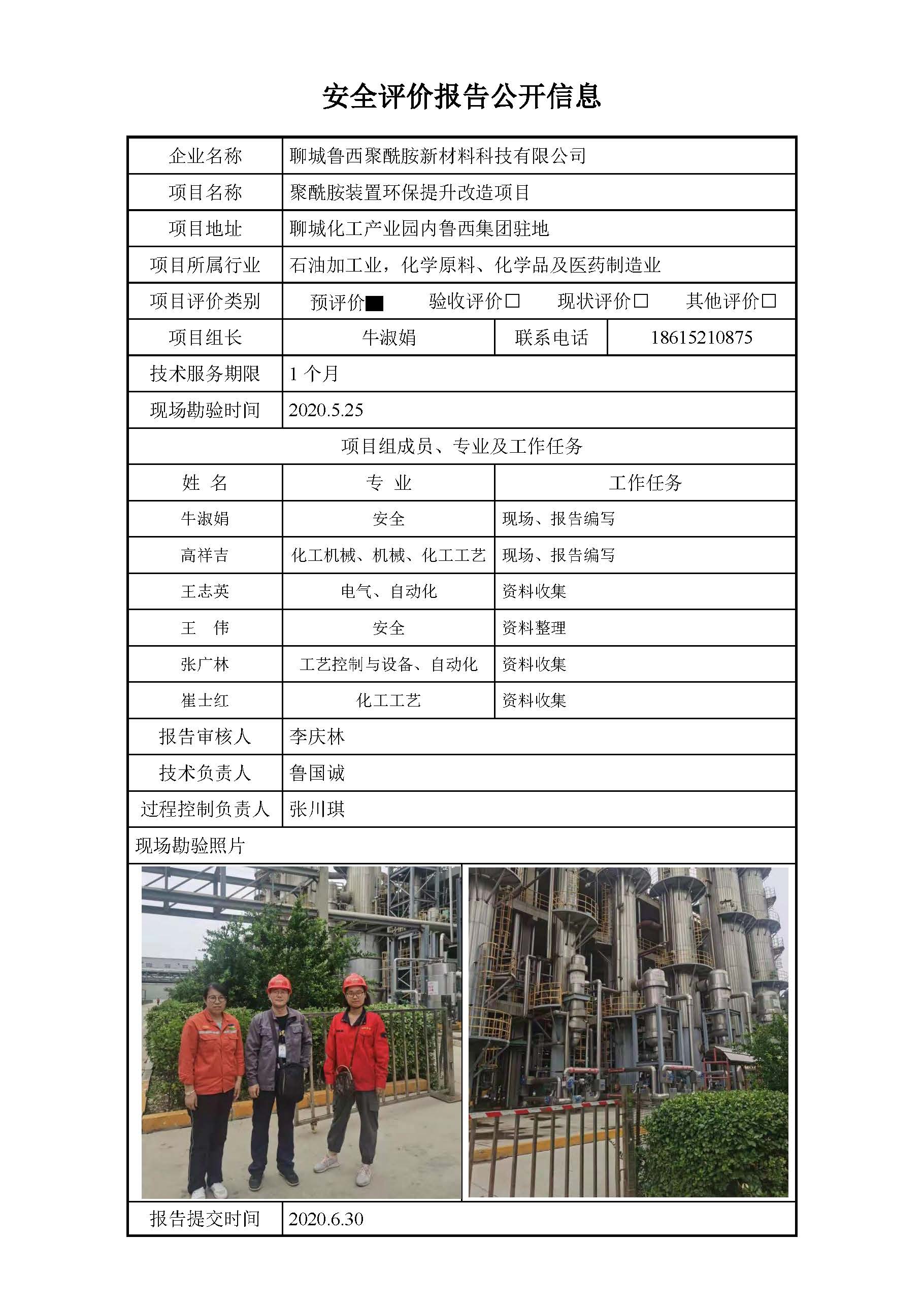 聊城鲁西聚酰胺新材料科技有限公司安评报告信息公开