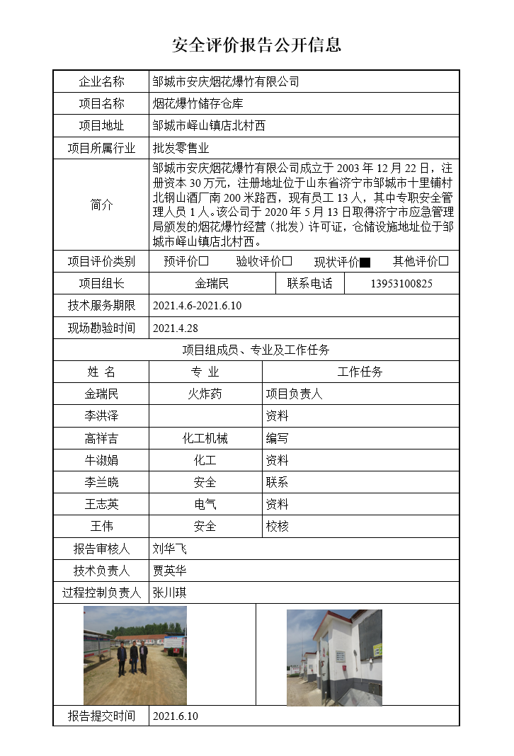 邹城市安庆烟花爆竹有限公司安全评价报告信息公开