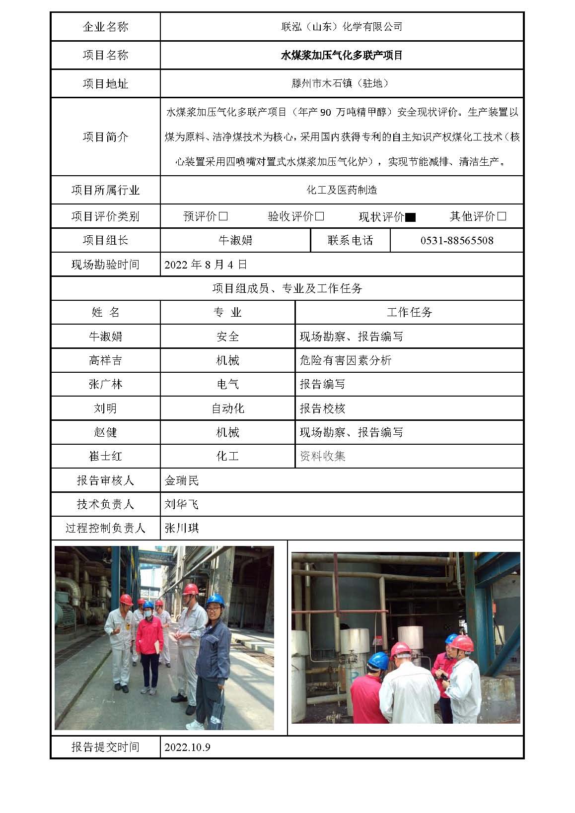 联泓(山东)化学有限公司安全评价报告信息公开